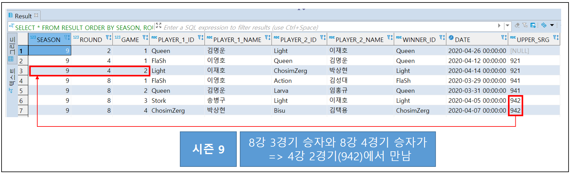CONNECT BY PRIOR SRG = UPPER_SRG -- 경기별 고유값과 상위 경기고유값으로 연결